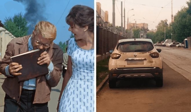 В фильме парочка гуляла по 1-му Сельскохозяйственному проезду — трамвайное депо и сейчас находится там же. Но все остальное изменилось – свободного пространства для прогулок уже нет, все заставлено машинами.